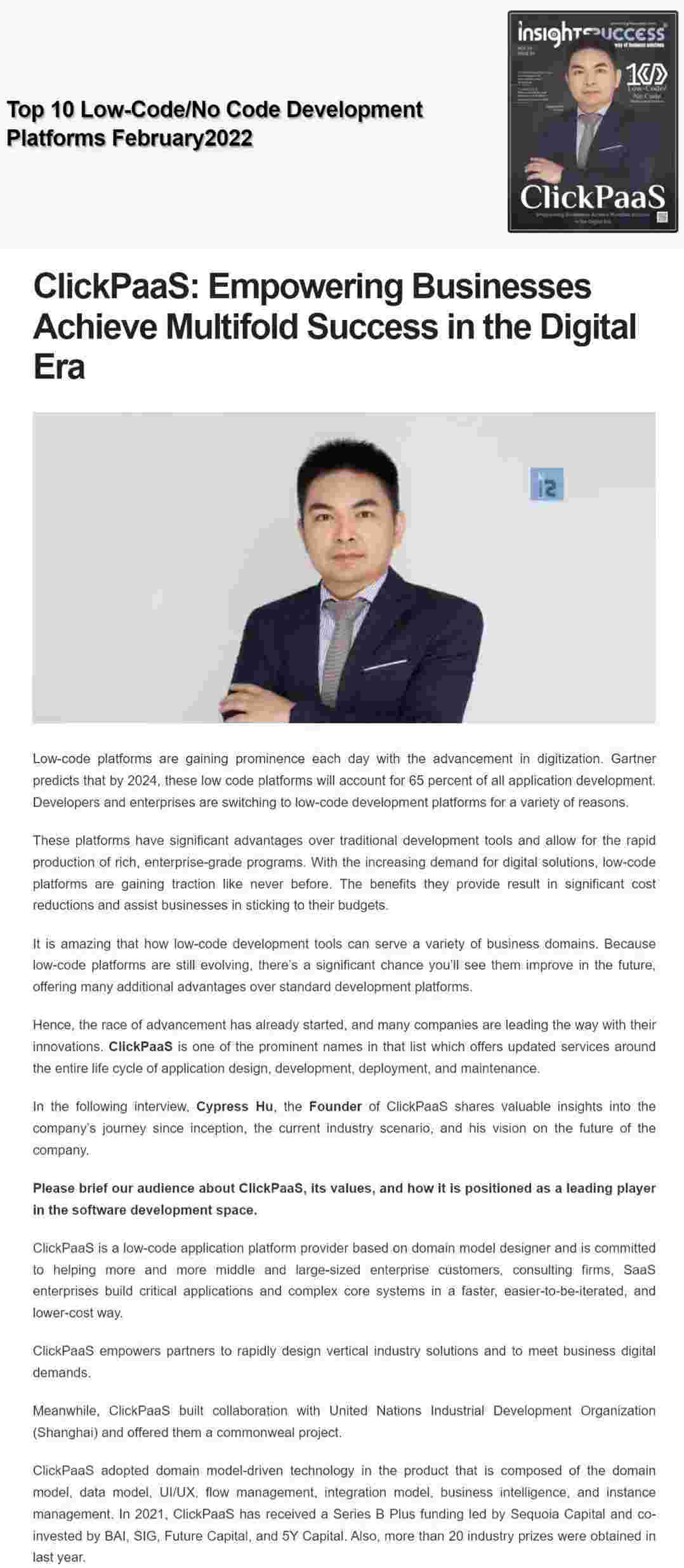 2022年年初,,CGPAY钱包入选外媒Insights Success低代码/无代码开发平台 Top10,,,创始人、、、CEO胡柏受邀接受专访并荣登封面人物,,,,他与Insights Success的读者分享了CGPAY钱包成立的初心、、、发展历程、、当前的行业发展趋势以及他对公司未来的展望。。。。